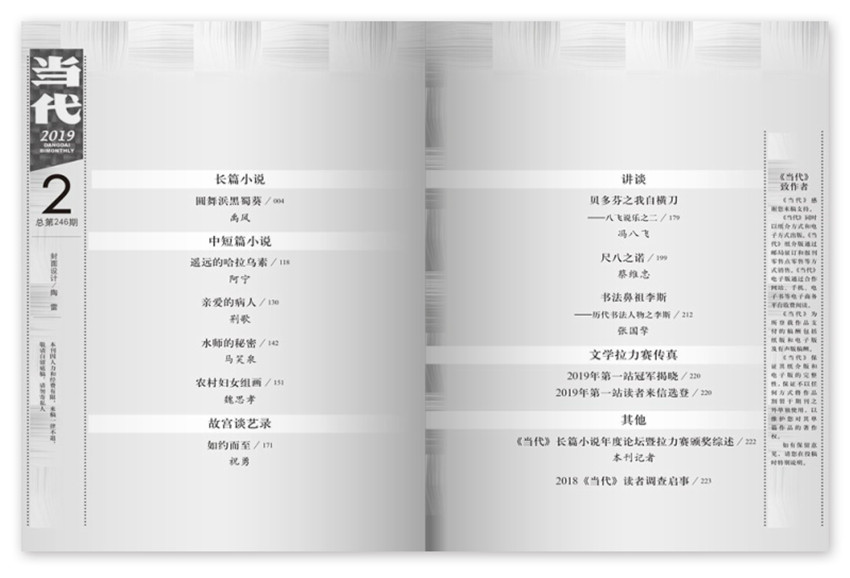 2019年《當(dāng)代》讀者調(diào)查啟事,2019年度讀者調(diào)查活動(dòng)截至發(fā)稿日,收到調(diào)查表上千份。能得到讀者如此關(guān)心,我們感謝不盡。讀者的反饋,價(jià)值匪淺,我們將在今后的編輯工作中認(rèn)真分析體會(huì),以回報(bào)讀者。匯總的調(diào)查結(jié)果如下:最喜歡的《當(dāng)代》長(zhǎng)篇作品:祝勇《故官六百年》。最喜歡的《當(dāng)代》中短篇小說(shuō):學(xué)蕓《東山印》。最喜歡的《當(dāng)代》散文:李修文《恨月亮》。