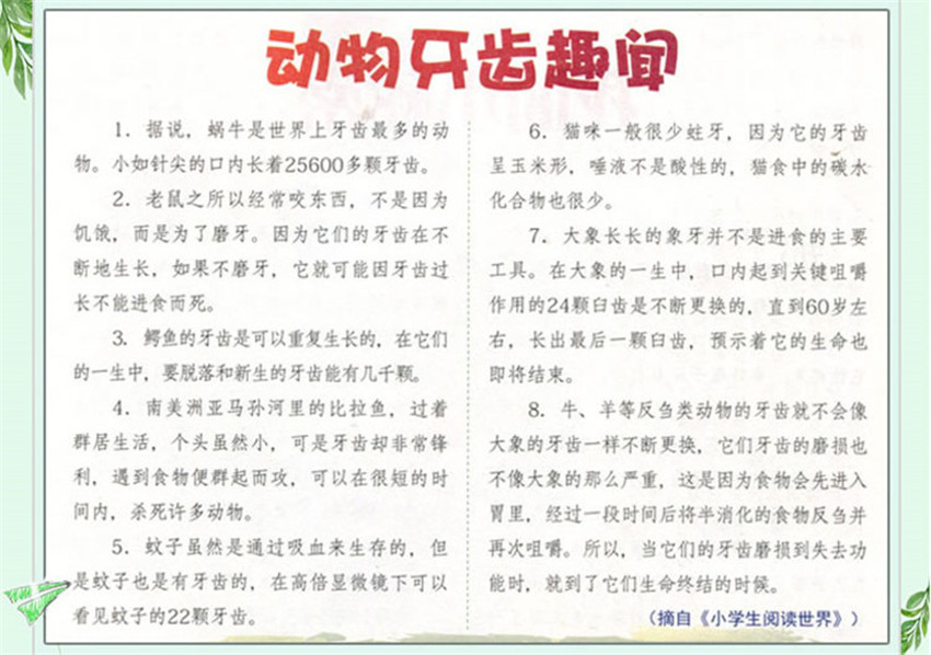沒有規(guī)矩,不成方圓。1.據(jù)說(shuō),蝸牛是世界上牙齒超多的動(dòng)物。小如針尖的口內(nèi)長(zhǎng)著25600多顆牙齒。2.老鼠之所以經(jīng)常咬東西,不是因?yàn)轲囸I,而是為了磨牙。因?yàn)樗鼈兊难例X在不斷地生長(zhǎng),如果不磨牙,它就可能因牙齒過(guò)長(zhǎng)不能進(jìn)食而死。