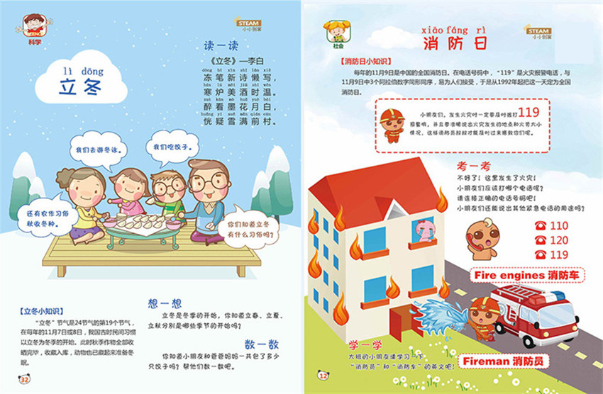 每月根據(jù)當(dāng)月的節(jié)日、季節(jié)、時令等,設(shè)置不同的學(xué)習(xí)主題。本月刊在感恩節(jié)、消防日、立冬等情境中融入了拼音、英語、填色、數(shù)學(xué)游戲、童謠、安全知識、詩歌、科普、繪本等知識的學(xué)習(xí)。