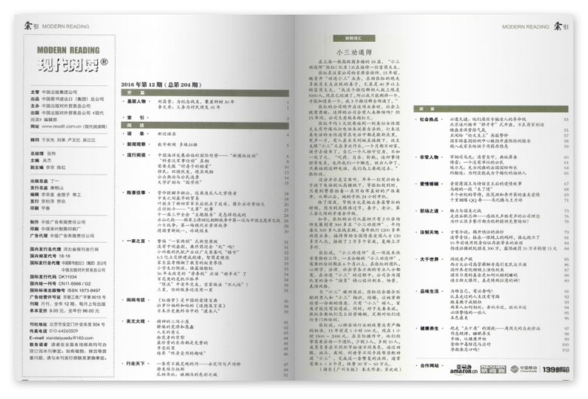 《現(xiàn)代閱讀》雜志創(chuàng)辦于2006年,注重理論聯(lián)系實(shí)際,創(chuàng)刊多年來(lái)得到了長(zhǎng)足發(fā)展,雜志內(nèi)容充實(shí)、版式清新,裝幀精美,深受廣大讀者好評(píng)。為讀者選書、買書、讀書提供幫助,從而推動(dòng)全民閱讀,達(dá)到豐富人們的精神文化生活、促進(jìn)我國(guó)圖書出版信息傳遞與交流的目的。