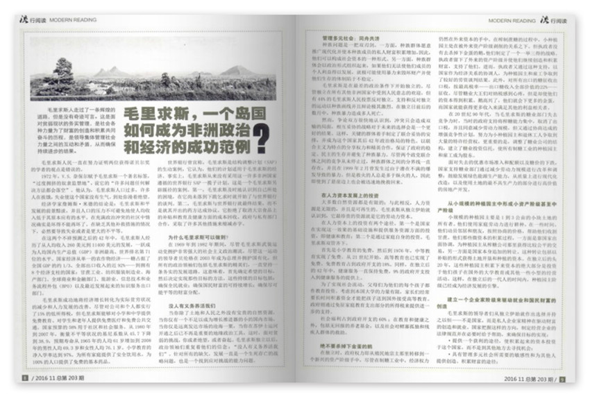 為什么毛里求斯可以做到?在1969年到1982年期間,盡管毛里求斯武裝運(yùn)動(dòng)黨擁護(hù)非常強(qiáng)大的社會(huì)主義政治潮流,盡管這一運(yùn)動(dòng)的領(lǐng)導(dǎo)者貝倫格在2003年成為總理并擁護(hù)國(guó)有化,但所有的改治領(lǐng)袖們包括毛里求斯的精英們,一直堅(jiān)持-”條務(wù)實(shí)的發(fā)展道路。這意味著,首先確定希望的目標(biāo),然后決定實(shí)現(xiàn)那些目標(biāo)的方法。