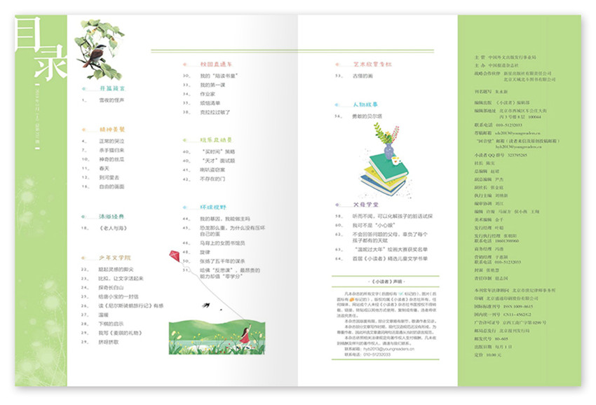 以傳播優(yōu)秀文化,推廣全民閱讀為使命,培養(yǎng)閱讀習(xí)慣,不斷提升文化素質(zhì)和生活品質(zhì),并且不斷推動(dòng)行業(yè)發(fā)展,集創(chuàng)新性,專(zhuān)業(yè)性和知識(shí)性于一體的少兒閱讀雜志。創(chuàng)刊多年來(lái)以其編輯、作者隊(duì)伍的專(zhuān)業(yè)性,與生活實(shí)際的貼近性,贏得廣大小讀者的喜愛(ài)和業(yè)內(nèi)人士的廣泛好評(píng),多方位提升讀者的閱讀品位,適合青少年讀者閱讀。