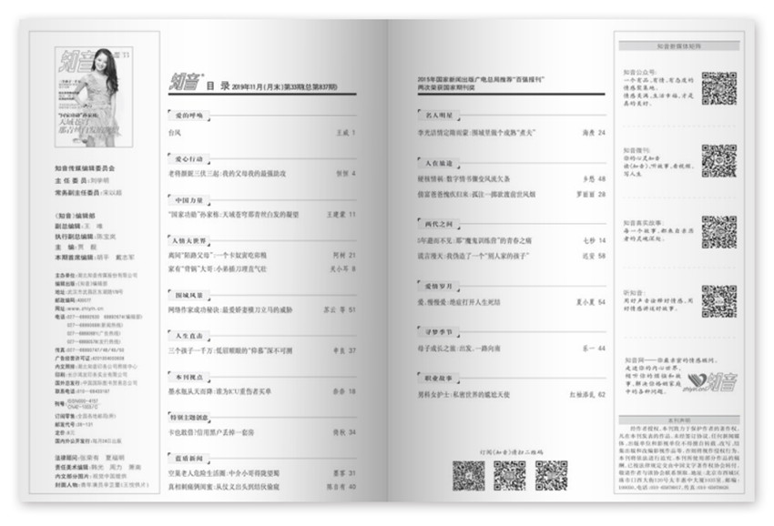 《知音》主要欄目:環(huán)球?qū)懻?,風(fēng)雨人生,記實(shí)前線,聚焦圍城,體悟生命,家有兒女,驚悚故事等。