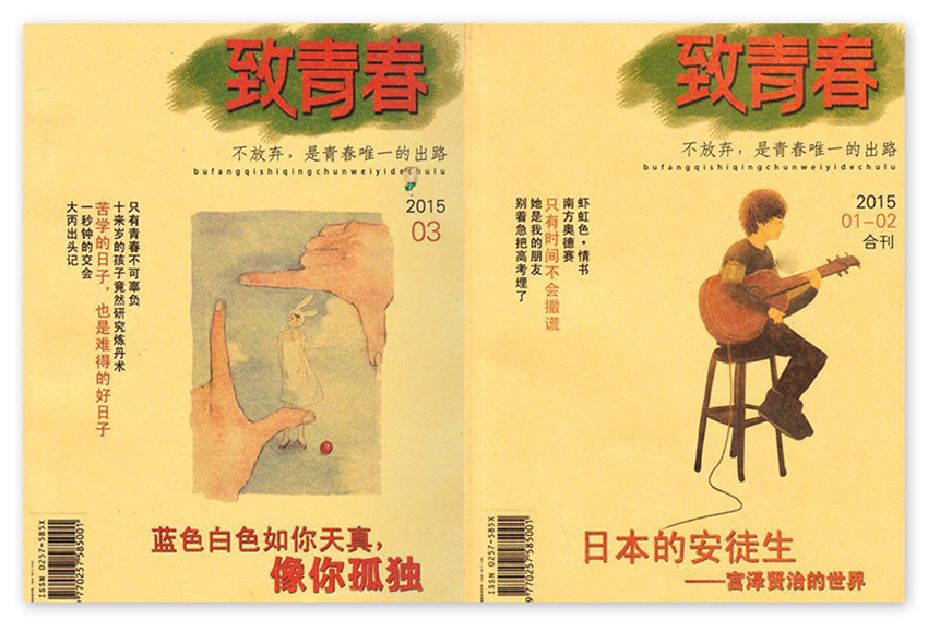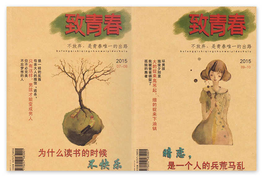 《致青春》是與《讀者》、《格言》、《意林》一起,專門針對正在人生成長關(guān)鍵期的中學(xué)生制作了一本精品雜志,中學(xué)生成長過程中面臨的學(xué)習(xí)的困惑,日常生活的趣味,考試作文的疑難,面臨親情的矛盾,朦朧愛情的憧憬和淺嘗。