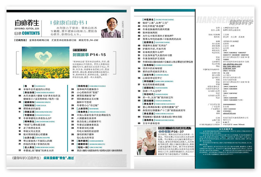 關(guān)注心靈開解,重視身體修煉,提倡行為健康;力邀專家主持專欄,名仕奉獻(xiàn)經(jīng)典,吸納古今,取法中外,觀念領(lǐng)先,知識系統(tǒng),著名健康教育家洪昭光教授領(lǐng)銜健康顧問,每期超值饋贈精制別冊。以40-60歲的中老年人為主要讀者群體,定位于有一定經(jīng)濟條件同時關(guān)注養(yǎng)生、有精力有時間有能力的中老年人,除了傳達(dá)“以養(yǎng)防病、以養(yǎng)祛病”的理念外,還會是一本關(guān)注中老年人及家庭成員身心健康的養(yǎng)生期刊。