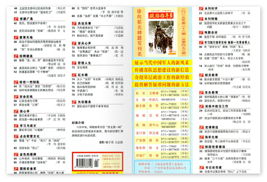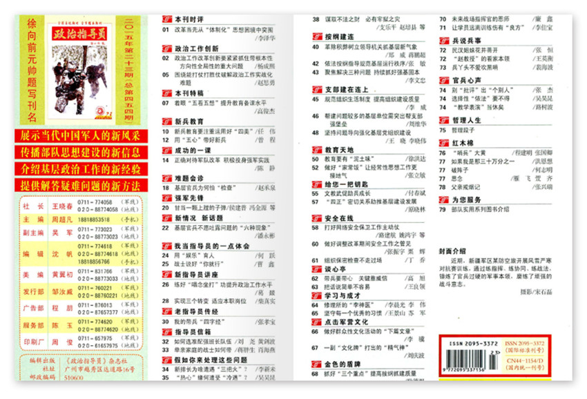 《政治指導(dǎo)員》雜志是在中國(guó)人民解放軍總政治部指導(dǎo)下創(chuàng)刊的政治工作期刊,元帥題寫刊名,被、國(guó)家新聞出版局評(píng)定為“中國(guó)期刊方陣期刊”、“全國(guó)百種重點(diǎn)期刊”,被中國(guó)人民解放軍總政治部列為全軍和武警部隊(duì)連以上單位必訂期刊。